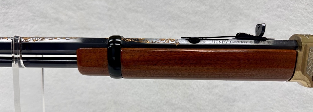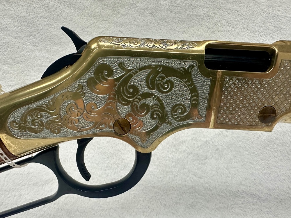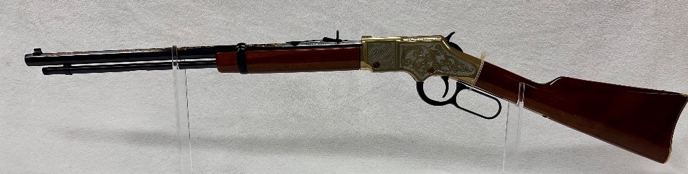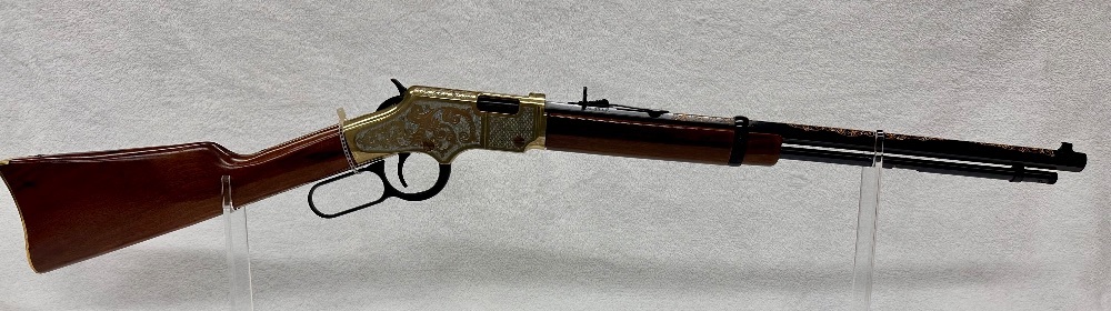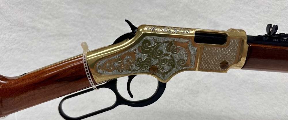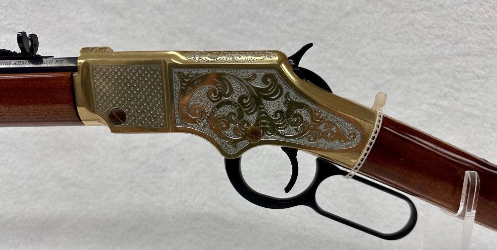The Henry Repeating Arms Golden Boy 22 is an American-made lever-action rifle. Known for its accuracy, lightweight design, and beautiful brass finish, this rifle is largely popular among shooters. It can take .22 Short, Long, and LR ammo, perfect for plinking or small game hunting.